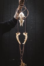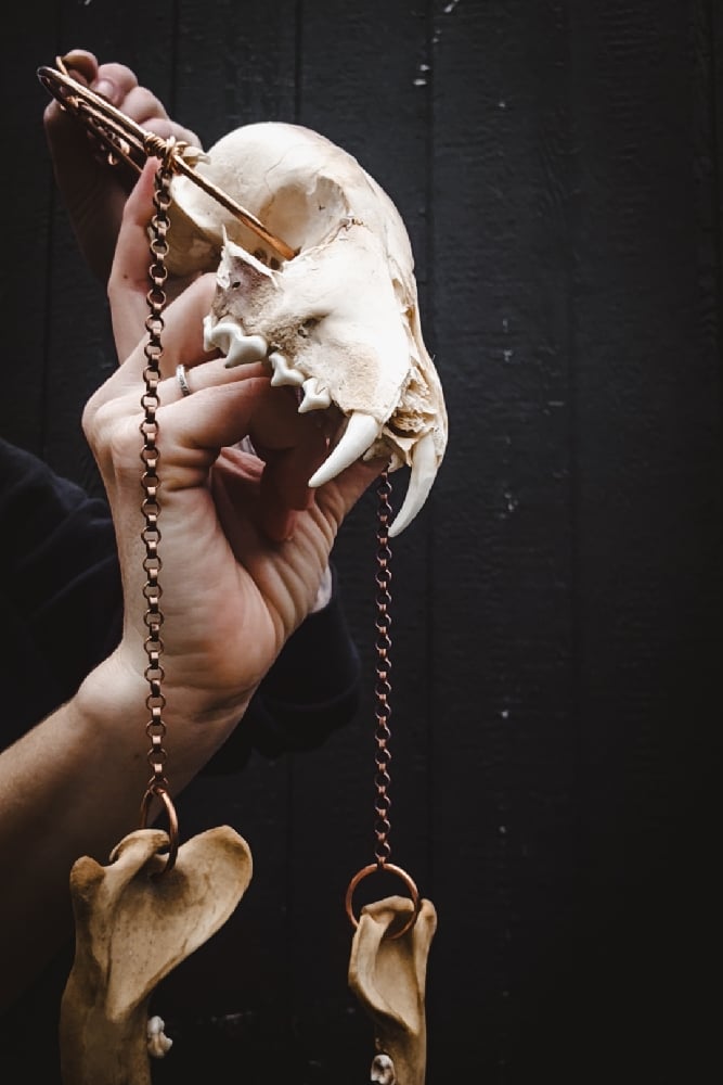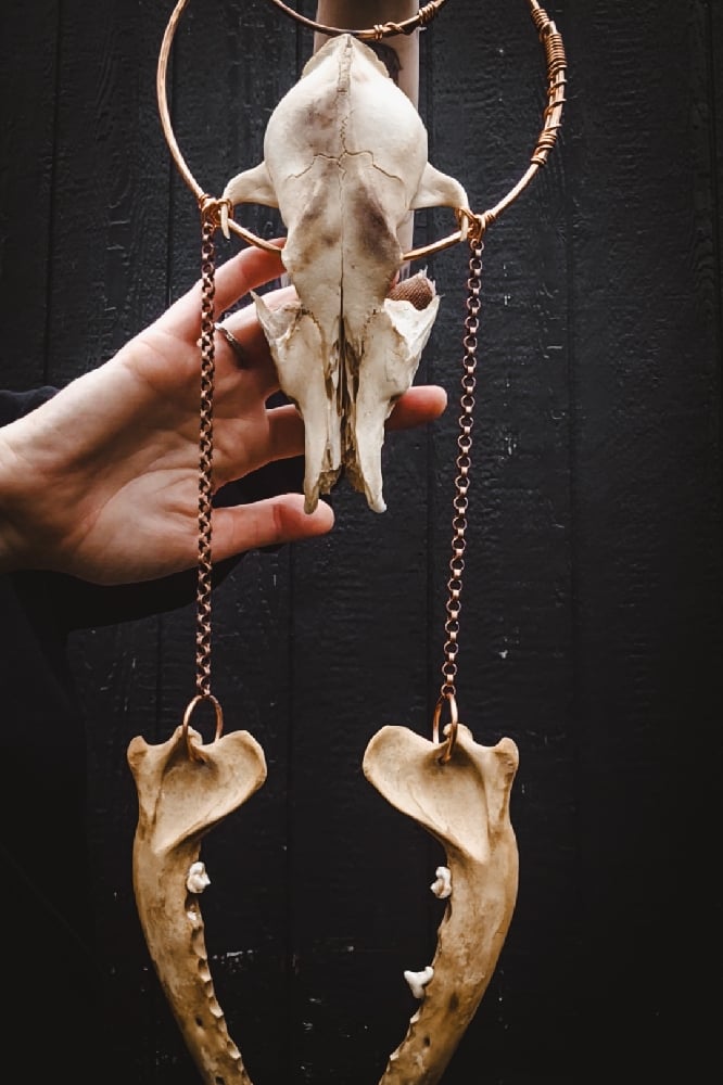 copper, copper/iron alloy chain, preserved assorted flora, and a scavenged canine skull and mandibles