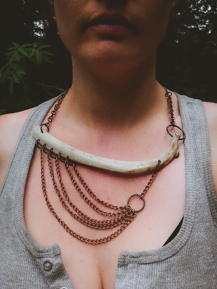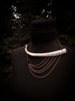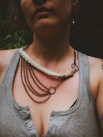 copper, copper/iron alloy chain, moss agate with embedded copper and scavenged coyote bone necklace.