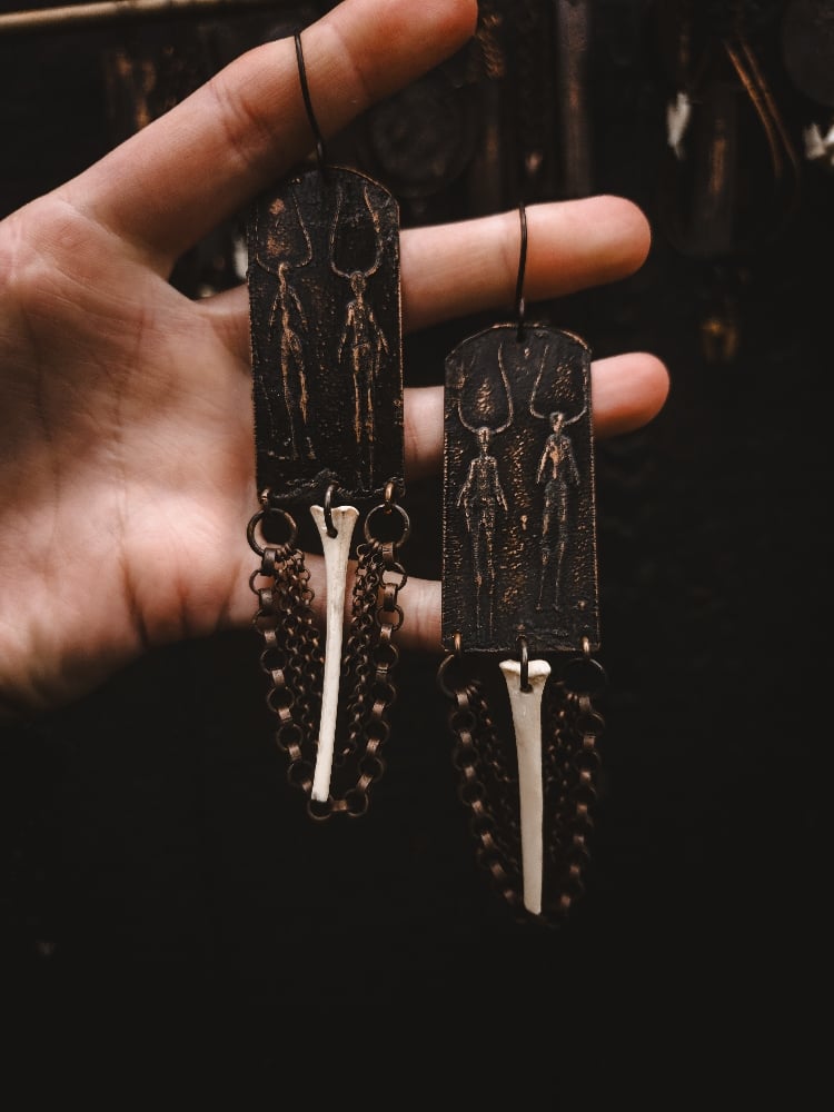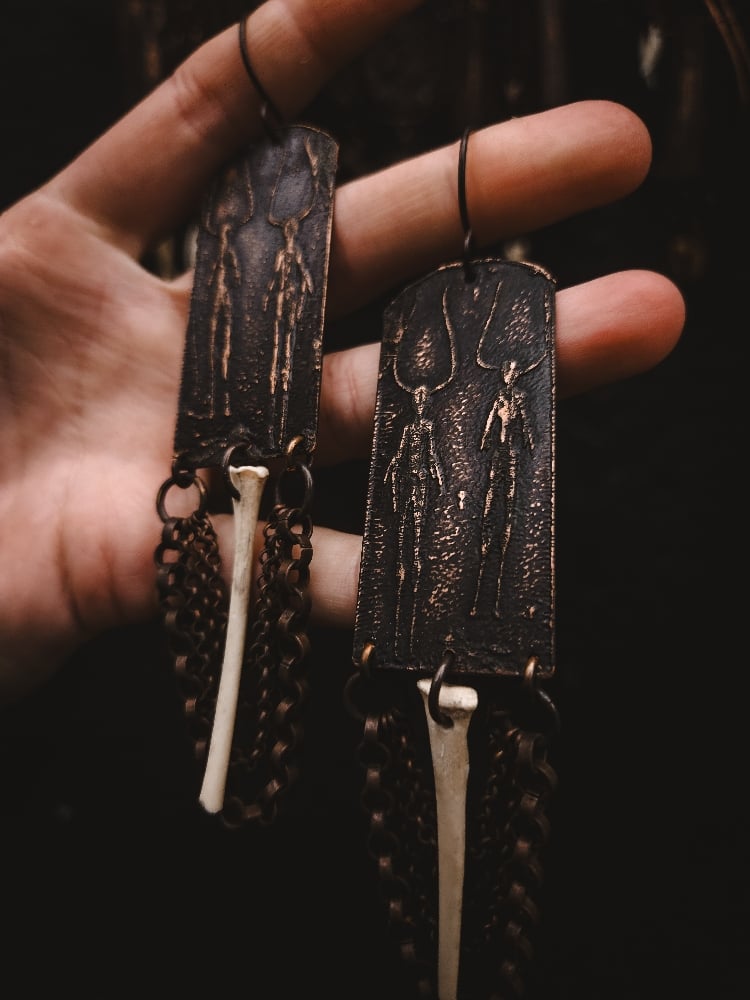 copper and scavenged cat bone earrings