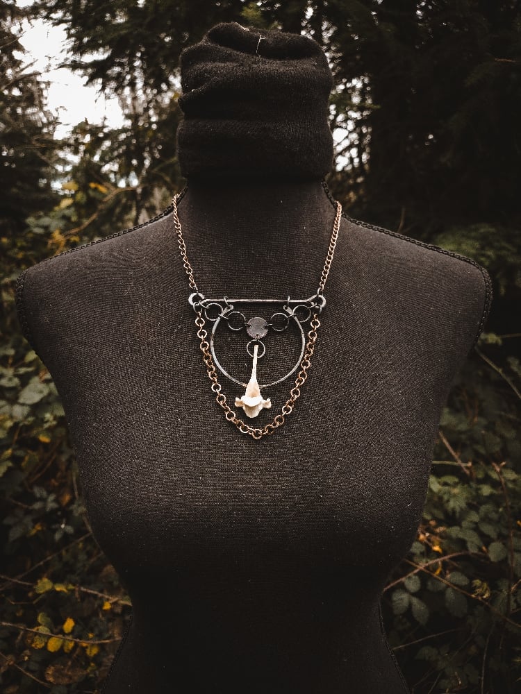 copper, copper/iron alloy chain, and scavenged cat bone necklace.