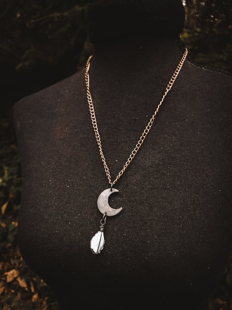 copper, copper/iron alloy chain, and raw moonstone necklace.