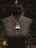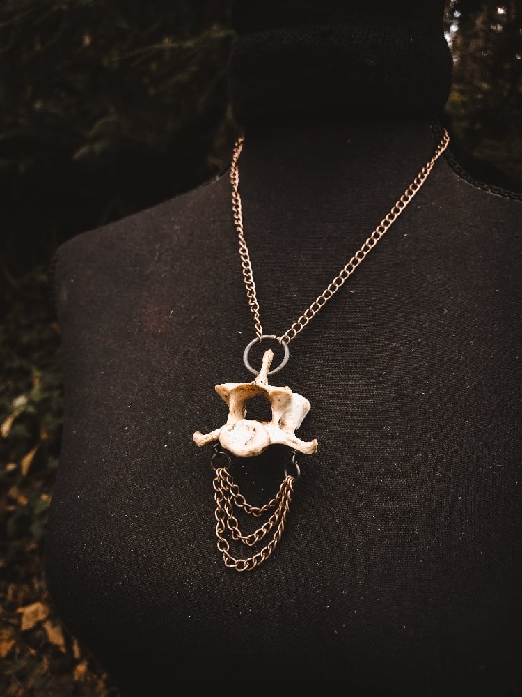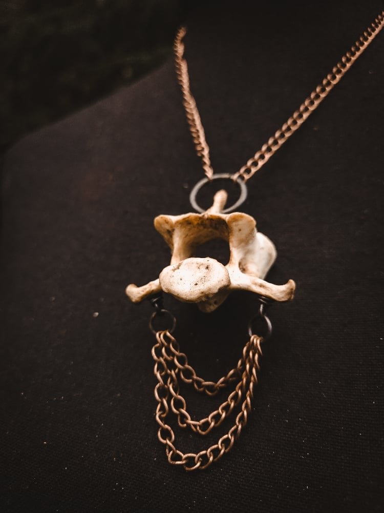copper, copper/iron alloy chain, and scavenged canine bone necklace.