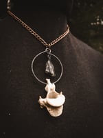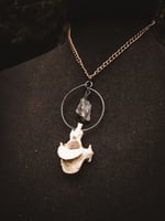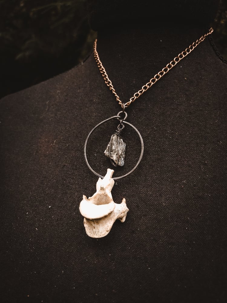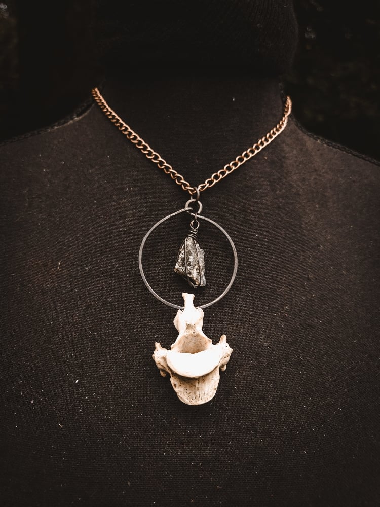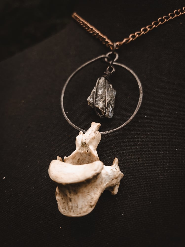copper, copper/iron alloy chain, raw labradorite and scavenged canine bone necklace.
