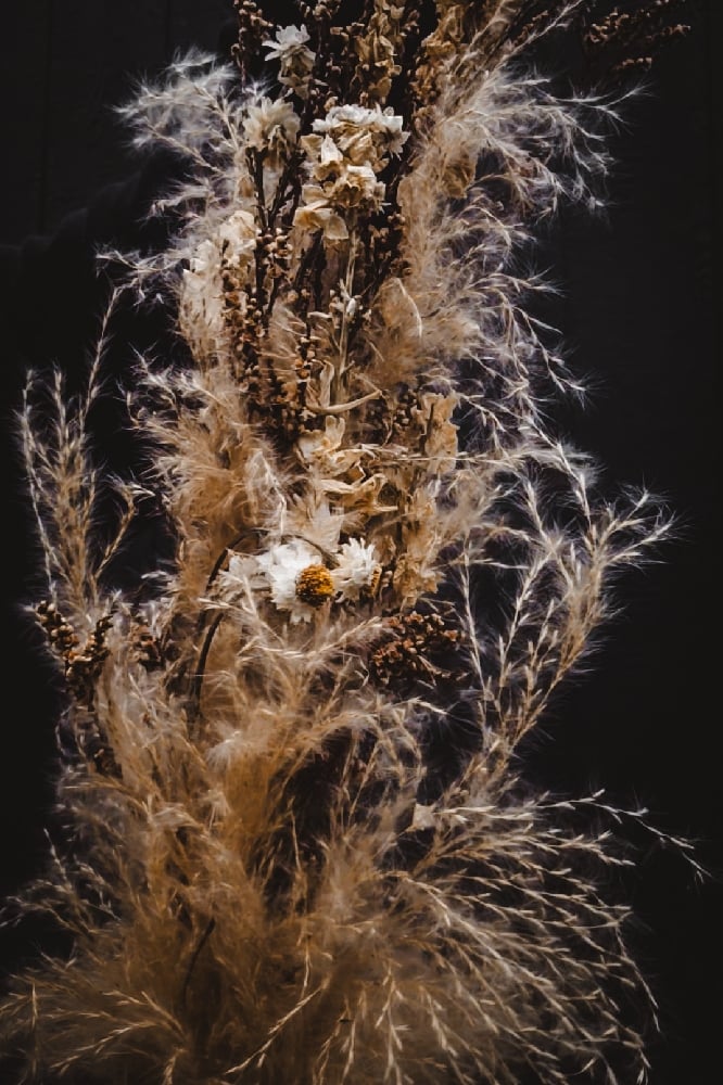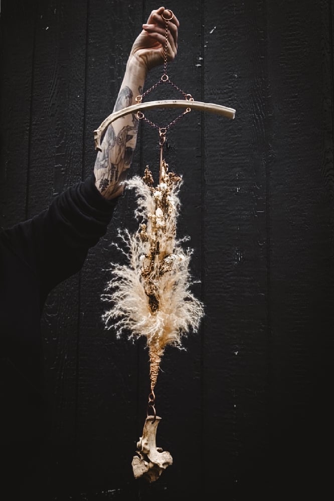 copper, copper/iron alloy chain, preserved assorted flora, and scavenged deer bones