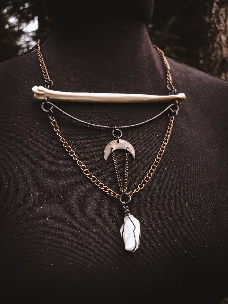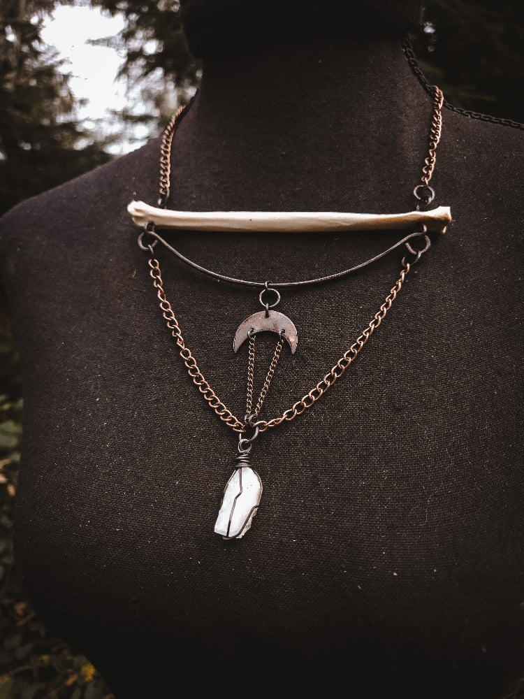 copper, copper/iron alloy chain, raw citrine and scavenged coyote bone necklace.