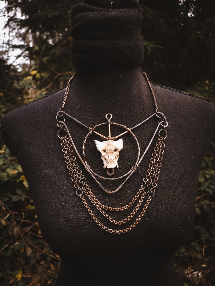 copper, copper/iron alloy chain, and scavenged coyote bone necklace.