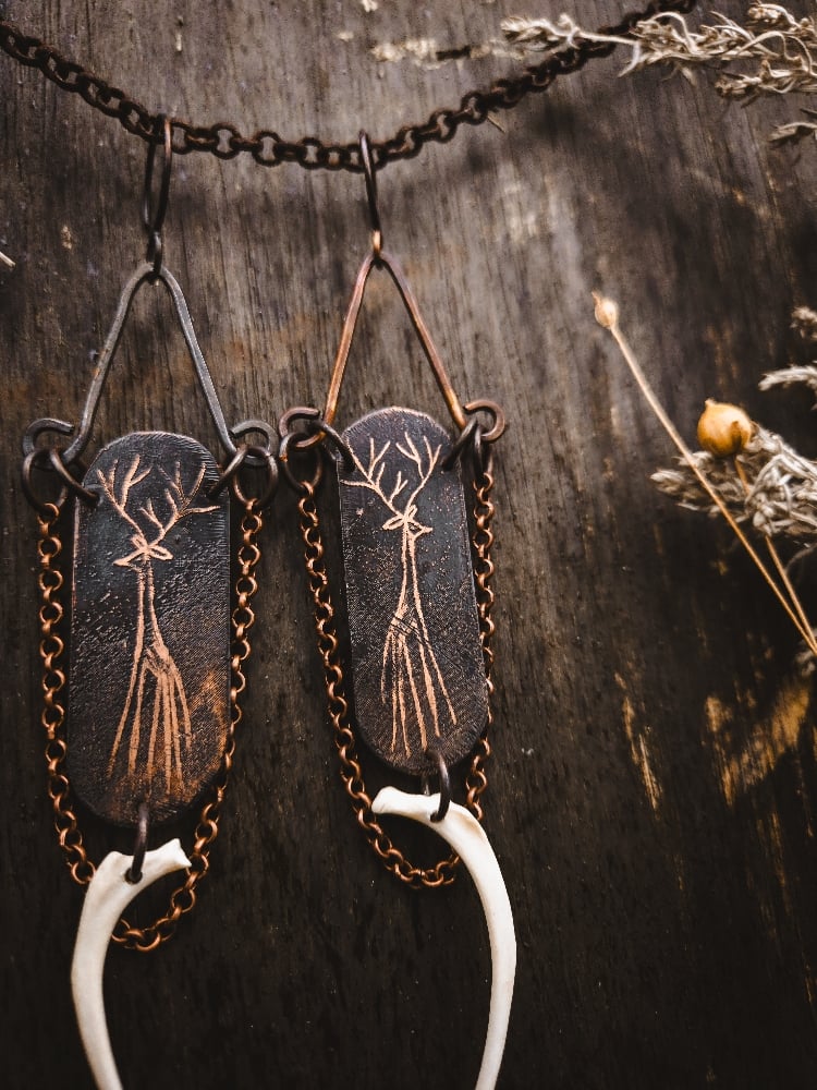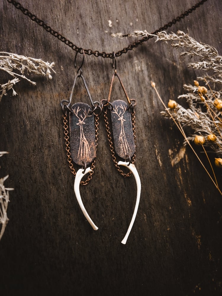 copper, copper/iron alloy chain and scavenged cat bone earrings