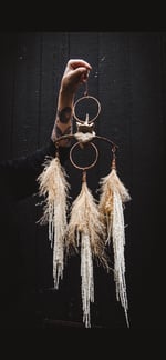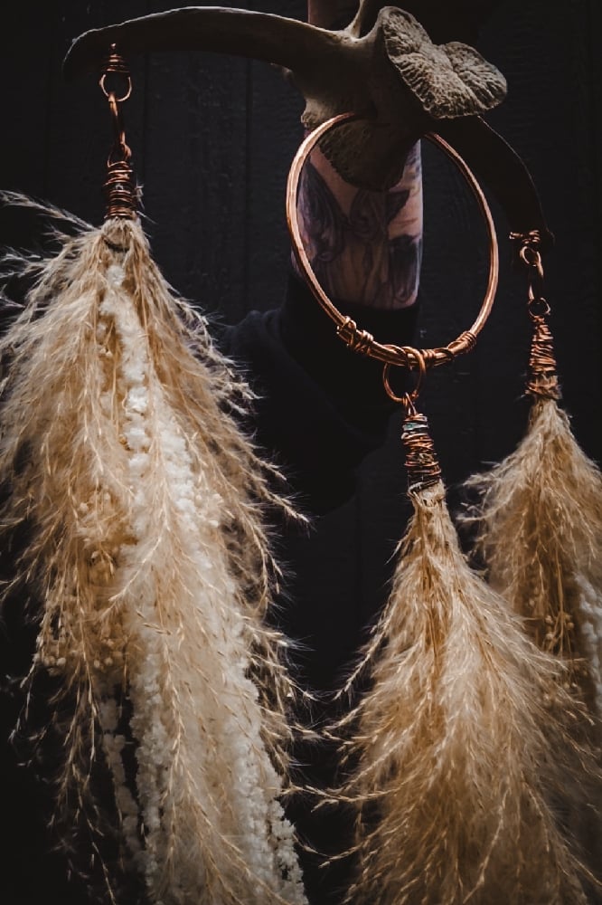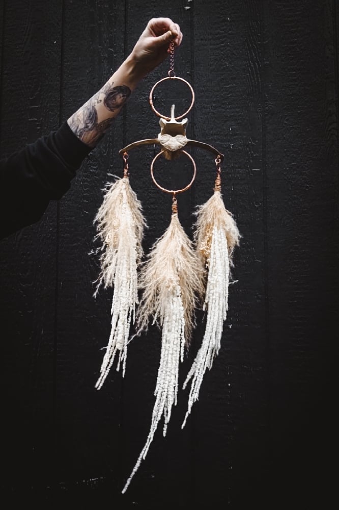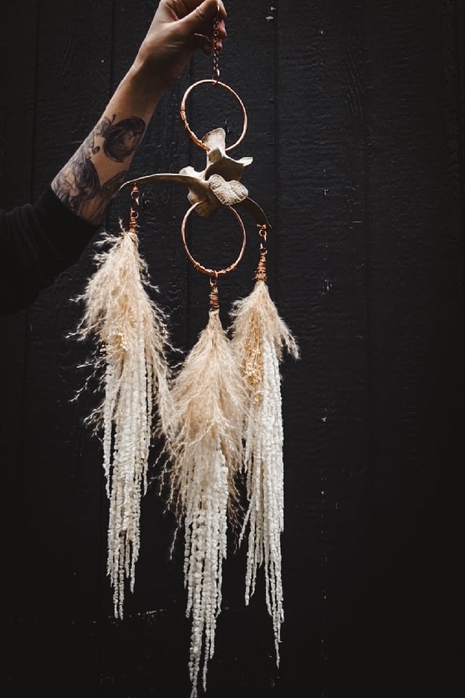 copper, copper/iron alloy chain, preserved assorted flora, and a scavenged elk vertebra.