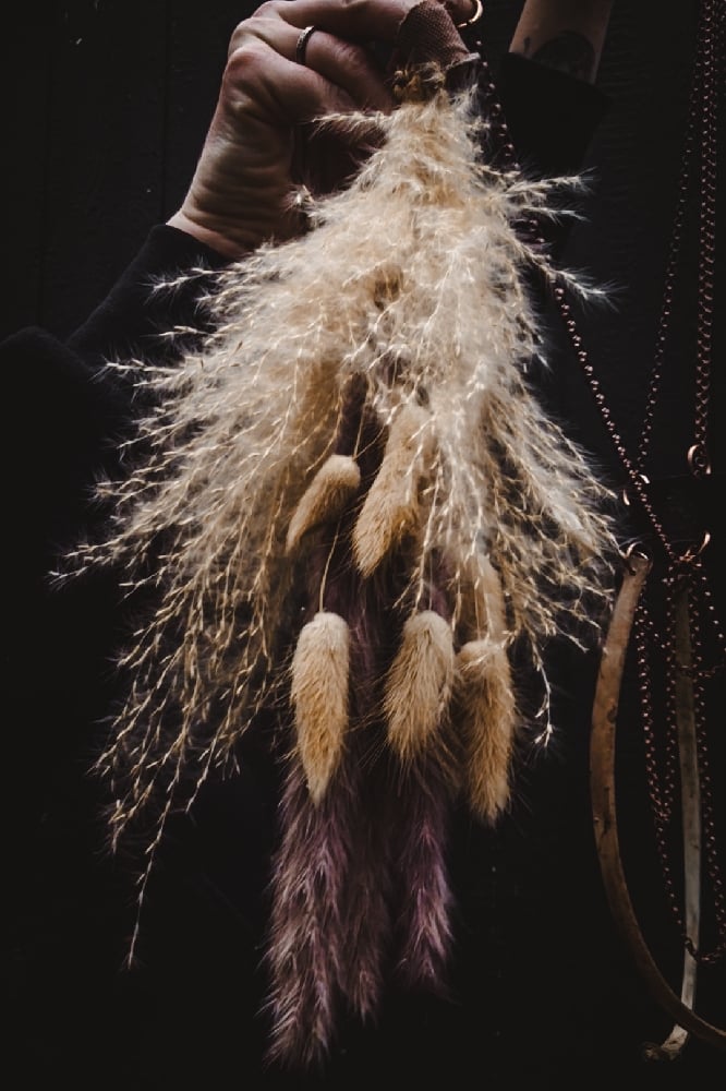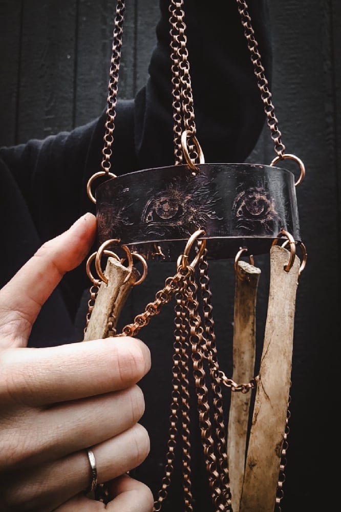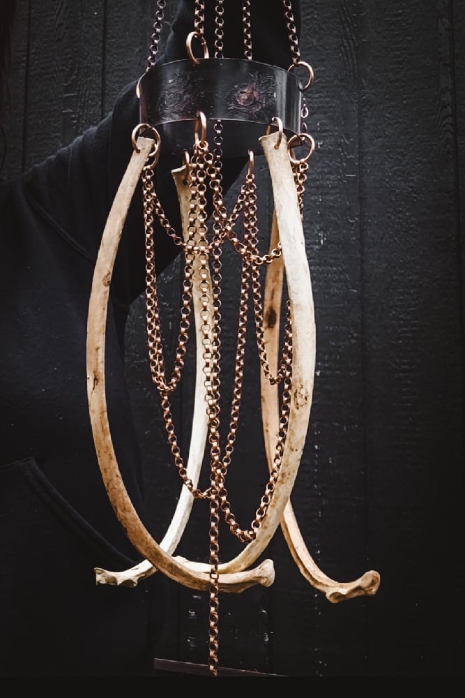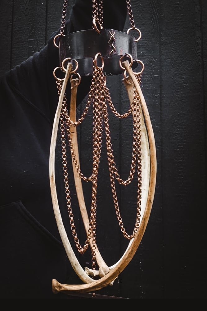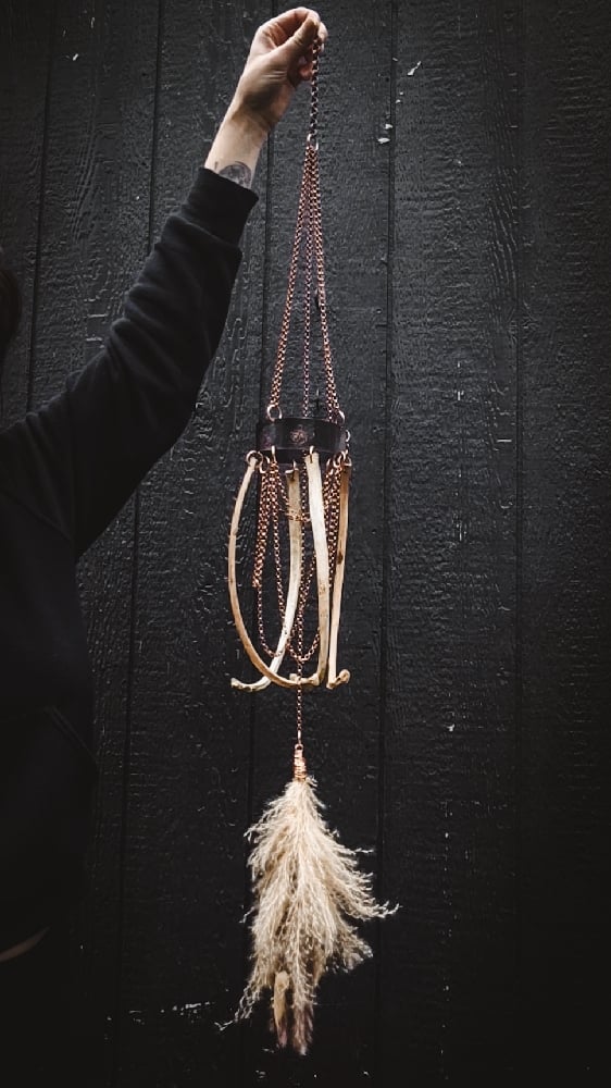 etched copper, copper/iron alloy chain, preserved assorted flora, and a scavenged elk ribs